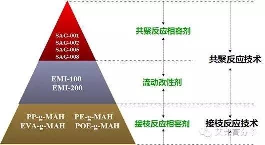 在官能團方面,IP具有酸酐基團,能夠和PA的氨基(或PC、PBT的羥基)發(fā)生化學(xué)反應(yīng)。通常情況下,該接枝共聚反應(yīng)在擠出過程中進行。